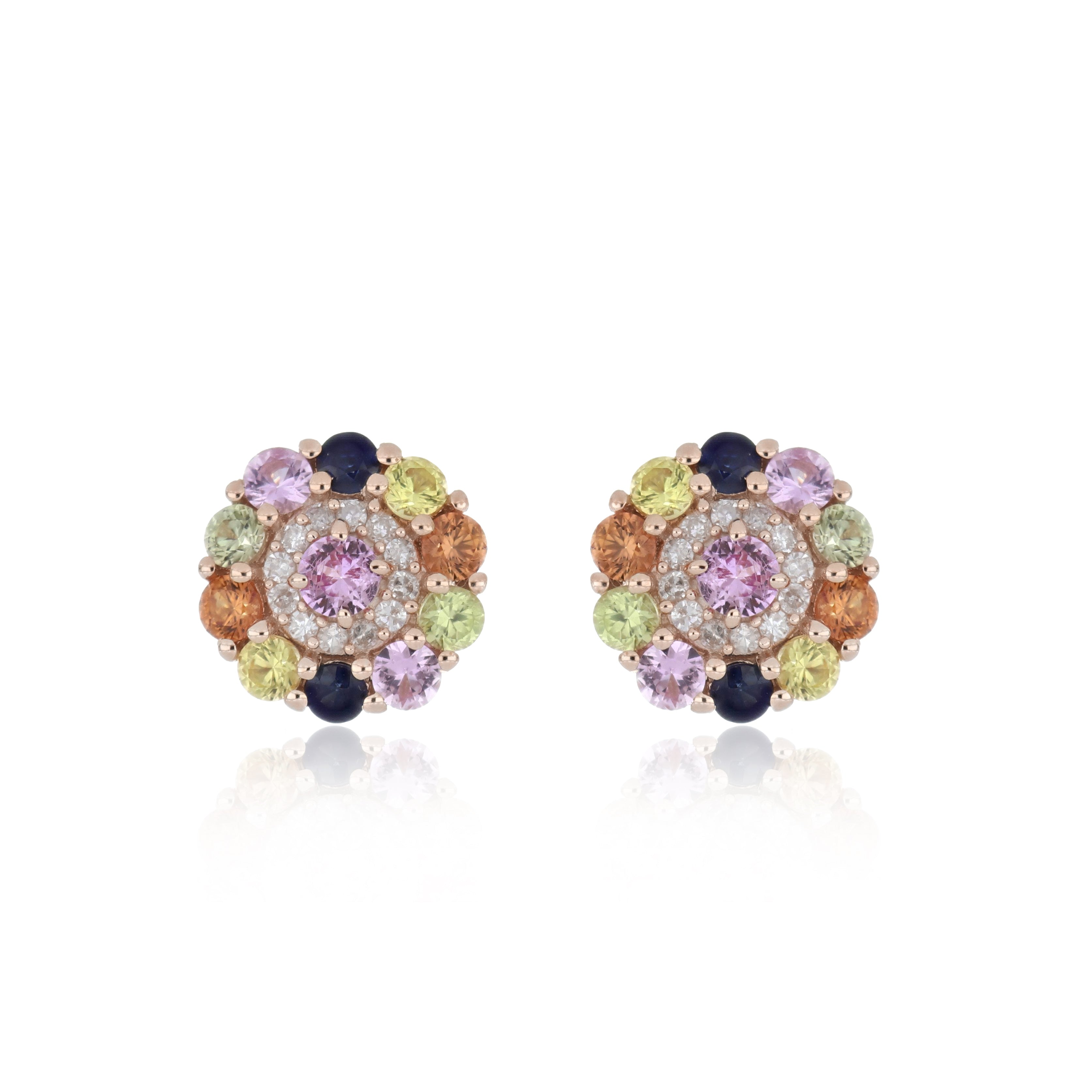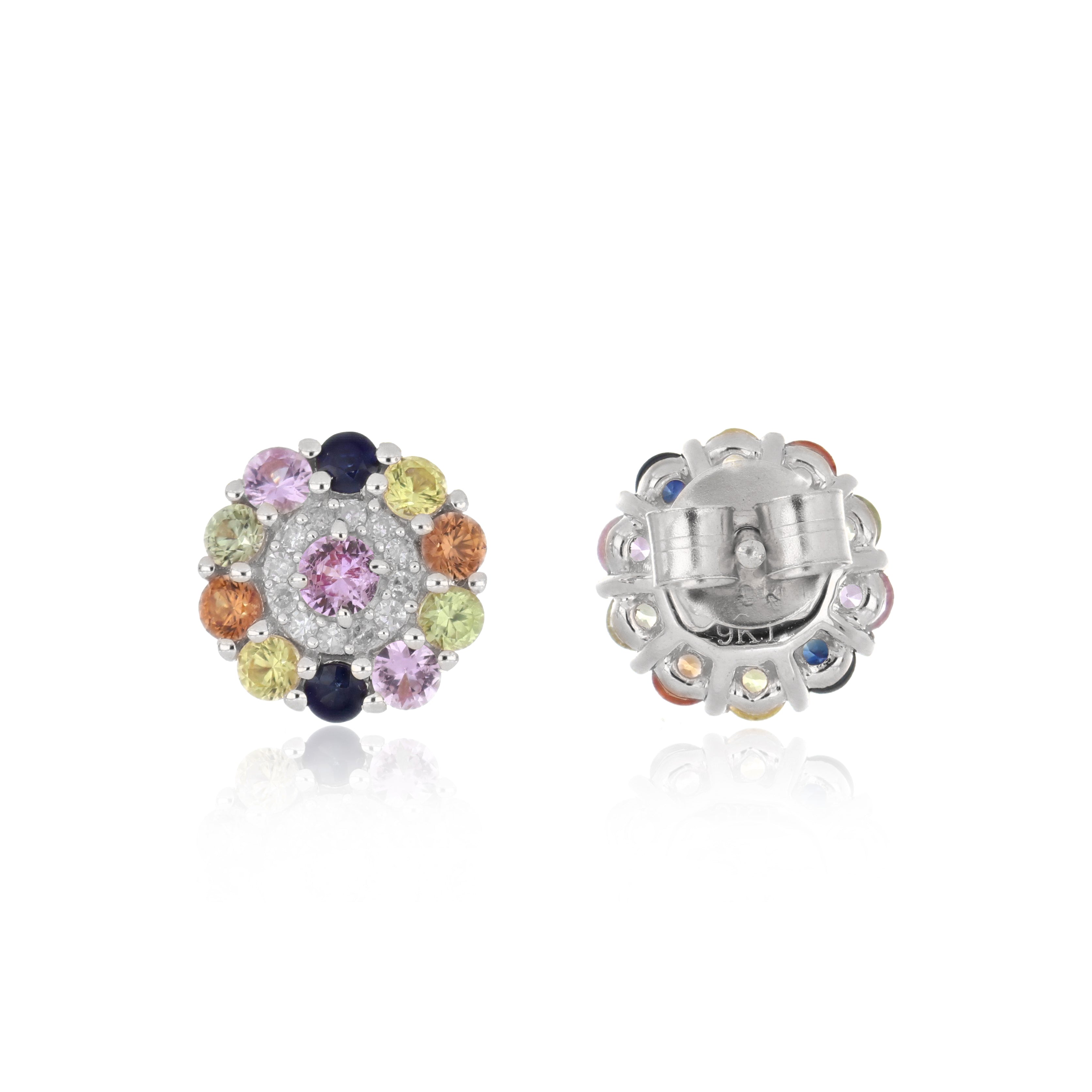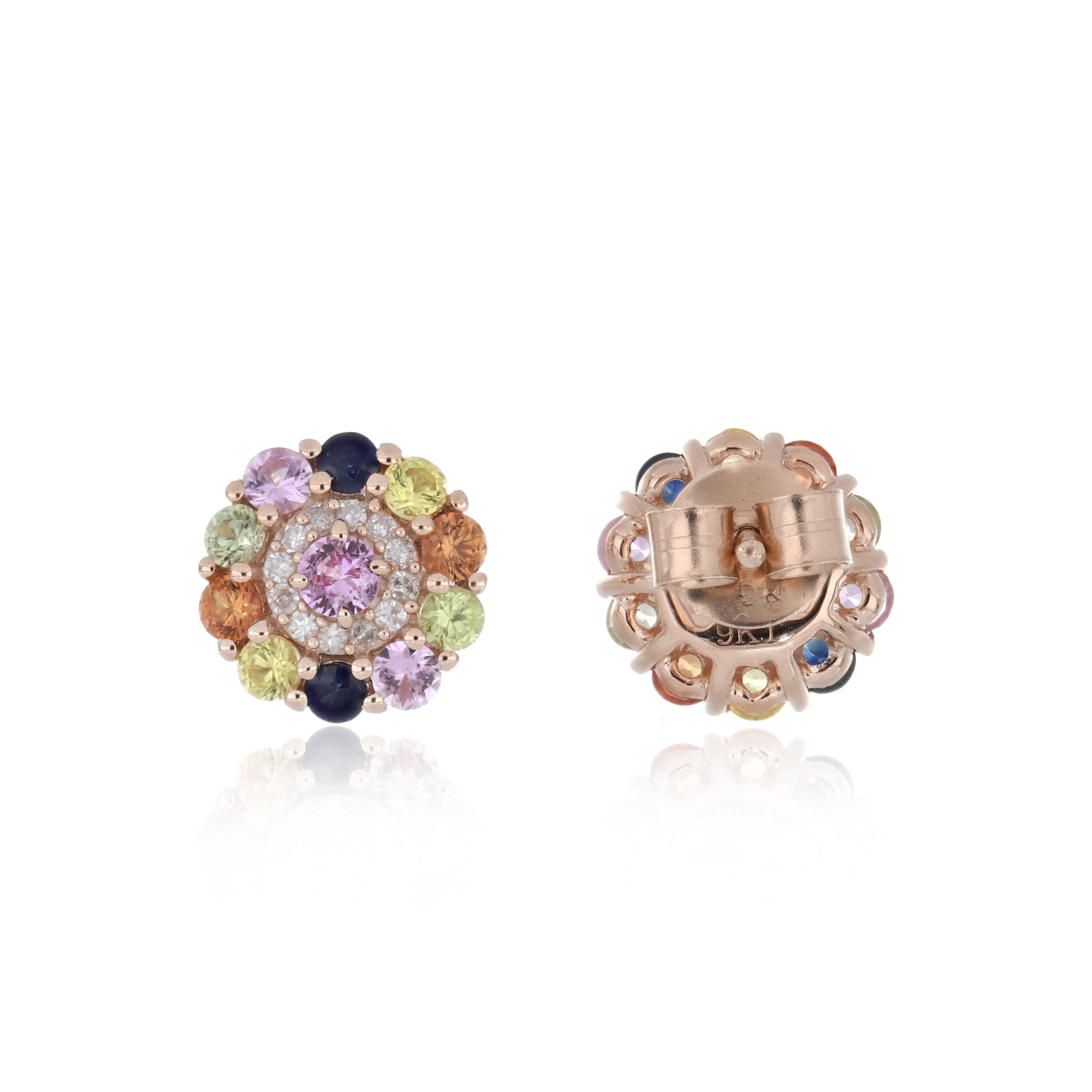 Add a burst of vibrant elegance with these Multi Sapphire With Diamond EF-VS 1.10ctw Push Post Earrings In 9KT Yellow Gold. Featuring an exquisite array of natural sapphires in dazzling colors, each earring celebrates beauty, joy, and individuality. Sparkling EF-VS quality diamonds enhance the brilliance of the multi-colored sapphires, while the warm glow of 9KT yellow gold completes the look with timeless sophistication. Perfect for adding a colorful sparkle to any occasion.