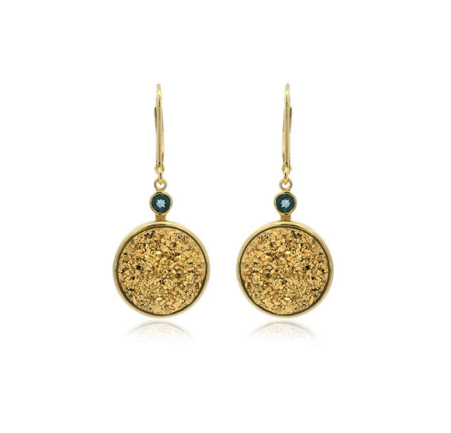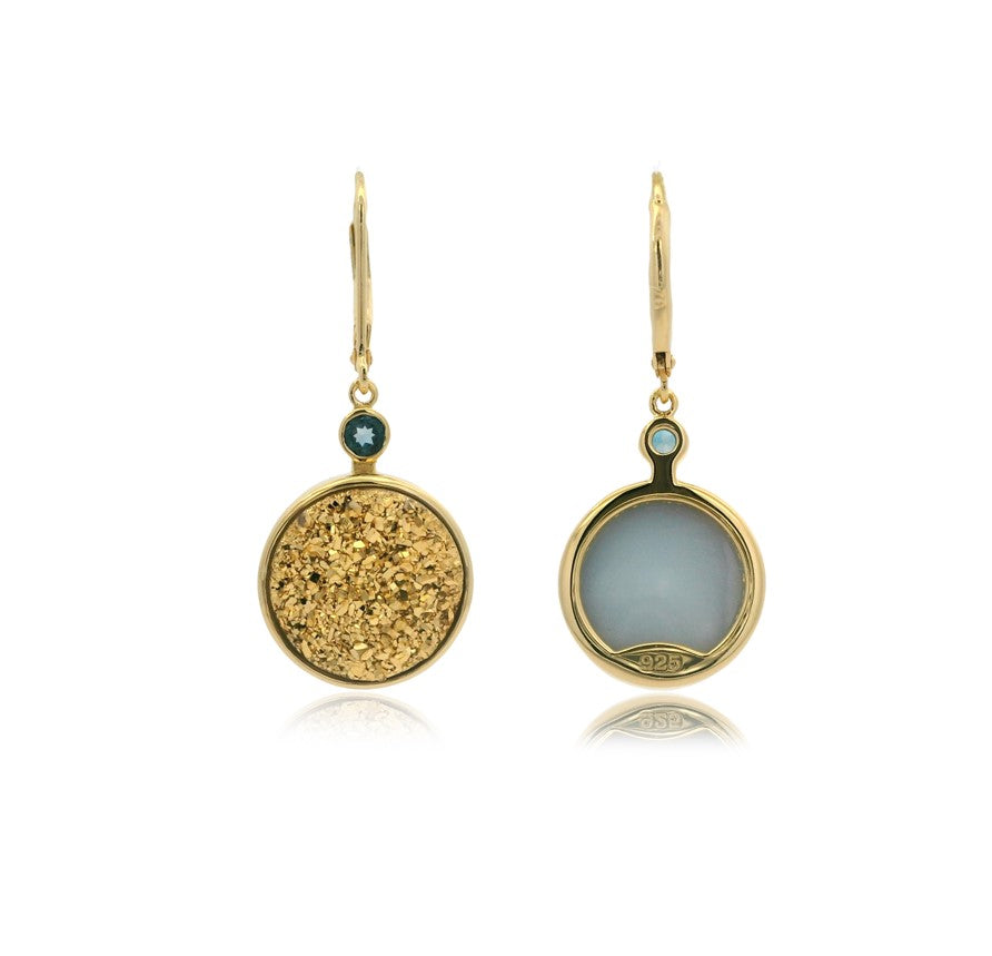 Enhance your jewelry collection with the Golden Druzy Quartz with London Blue Topaz 19.70ctw Earrings, crafted in 925 sterling silver and plated in elegant yellow gold. These earrings feature shimmering golden druzy quartz complemented by vibrant London blue topaz stones, creating a stunning visual contrast. The durable sterling silver base with yellow gold plating ensures long-lasting shine and sophistication, making these earrings suitable for any occasion.