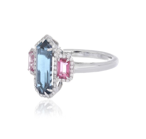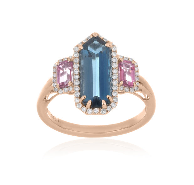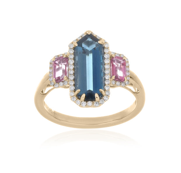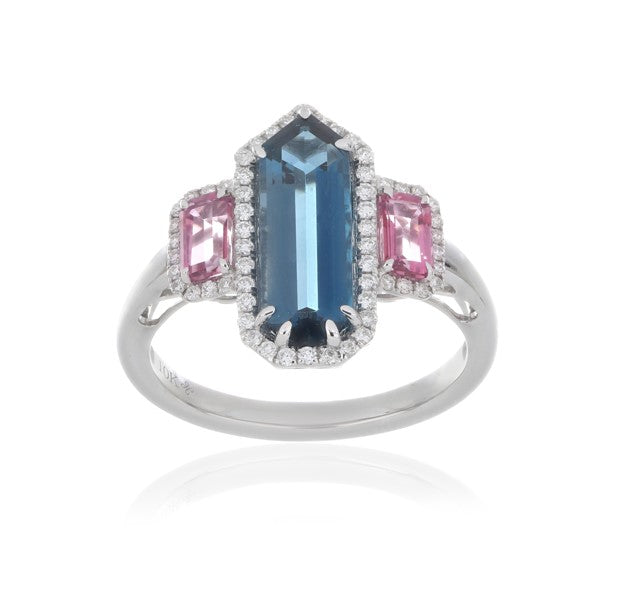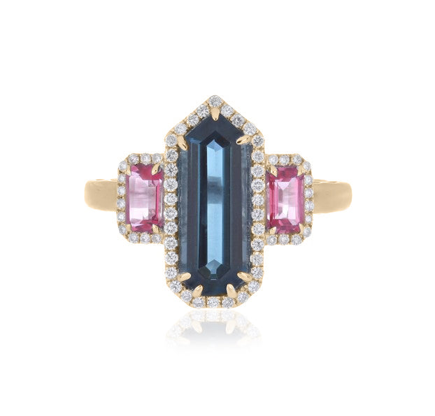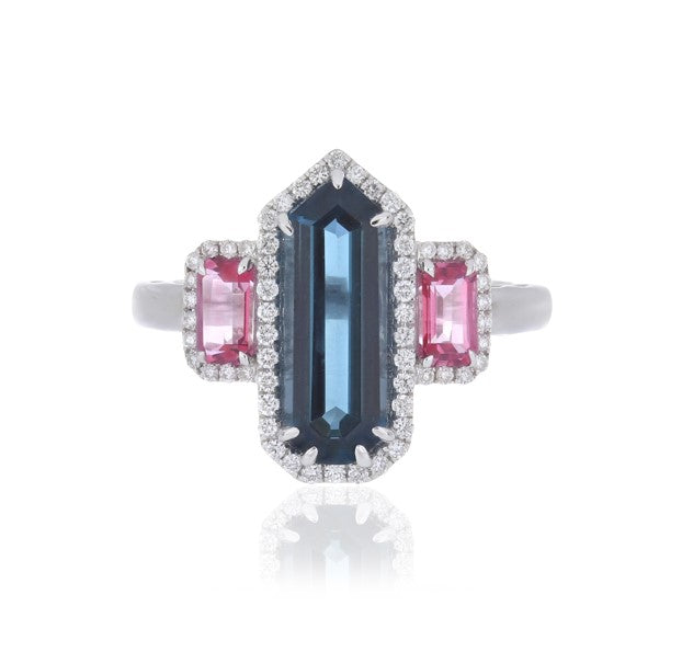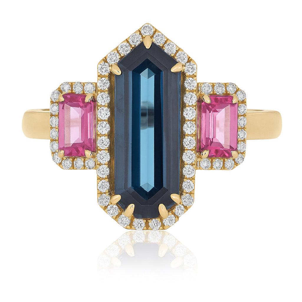 Bold and captivating, this ring showcases a 5.80 carat London Blue Topaz, admired for its deep ocean-blue hue and exceptional brilliance. The centerpiece is elegantly accented with EF-VS quality diamonds, adding radiant sparkle and sophistication.