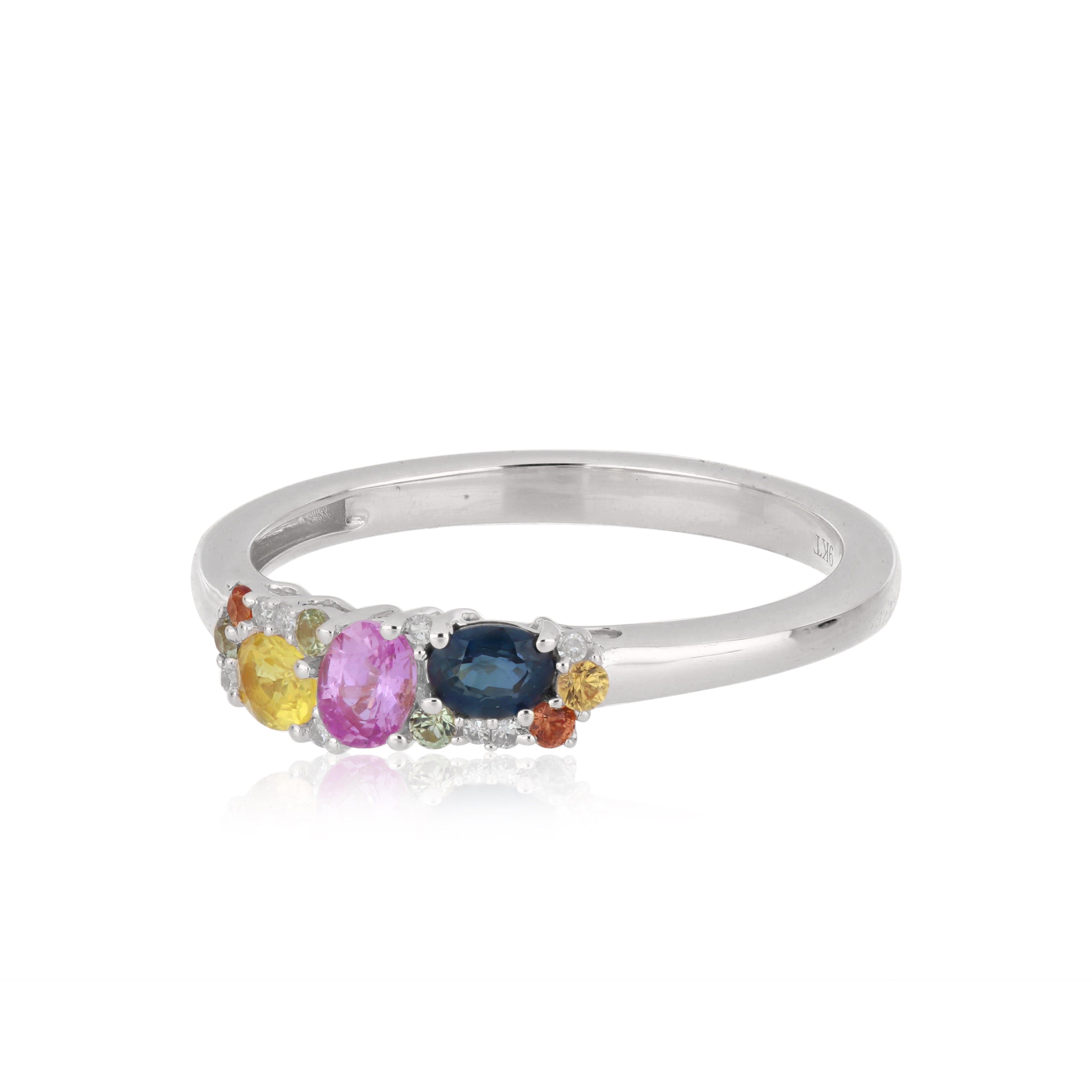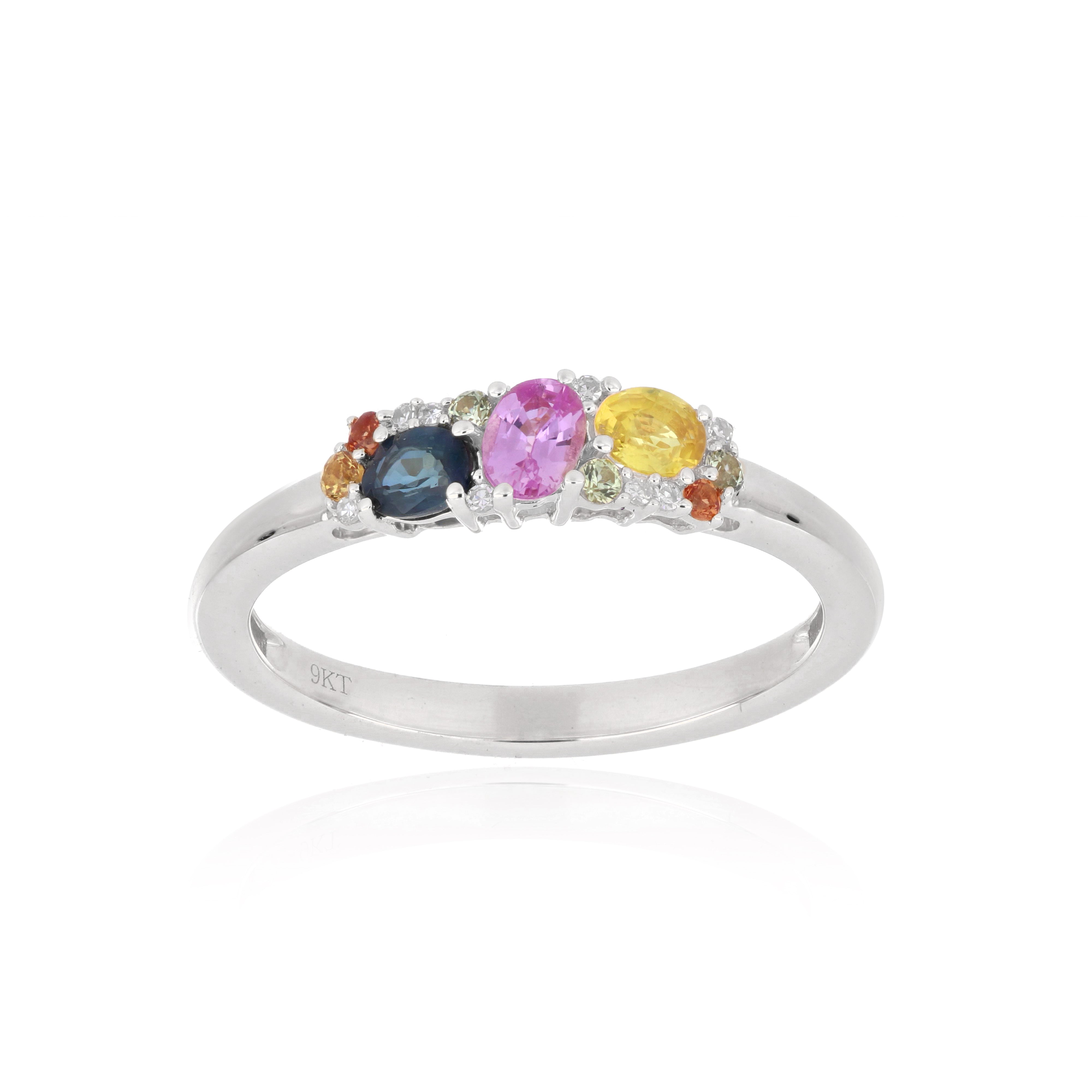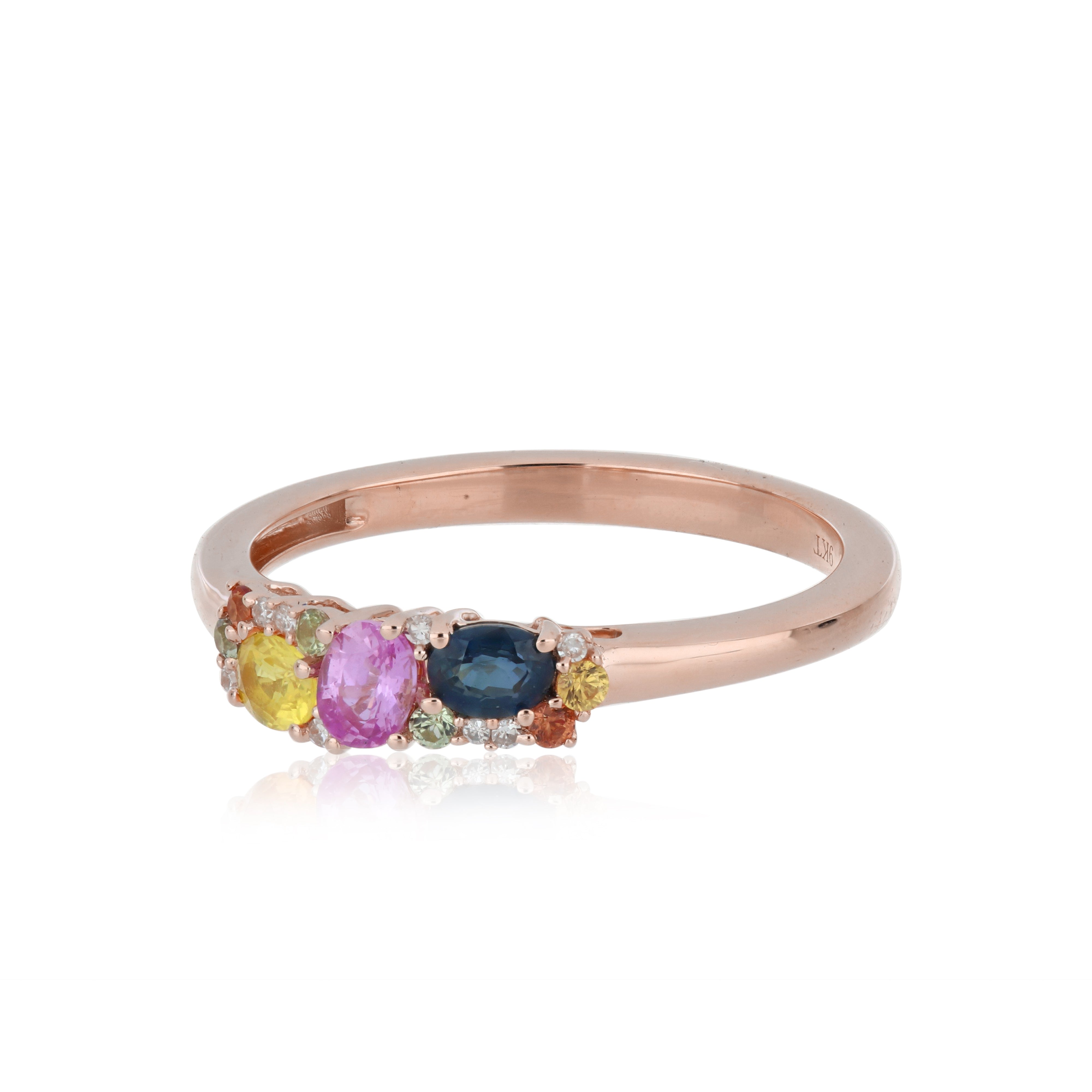 Celebrate color and sophistication with this Multi Sapphire With Diamond EF-VS 0.80ctw Ring In 9KT Yellow Gold. A stunning combination of natural sapphires in vibrant hues creates a captivating spectrum of beauty, enhanced by the brilliance of EF-VS quality diamonds. The warm glow of 9KT yellow gold perfectly complements the colorful gemstones, making this ring a joyful expression of luxury and style.