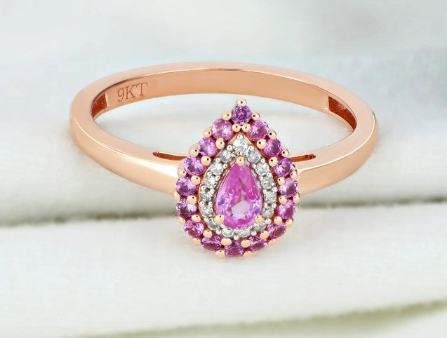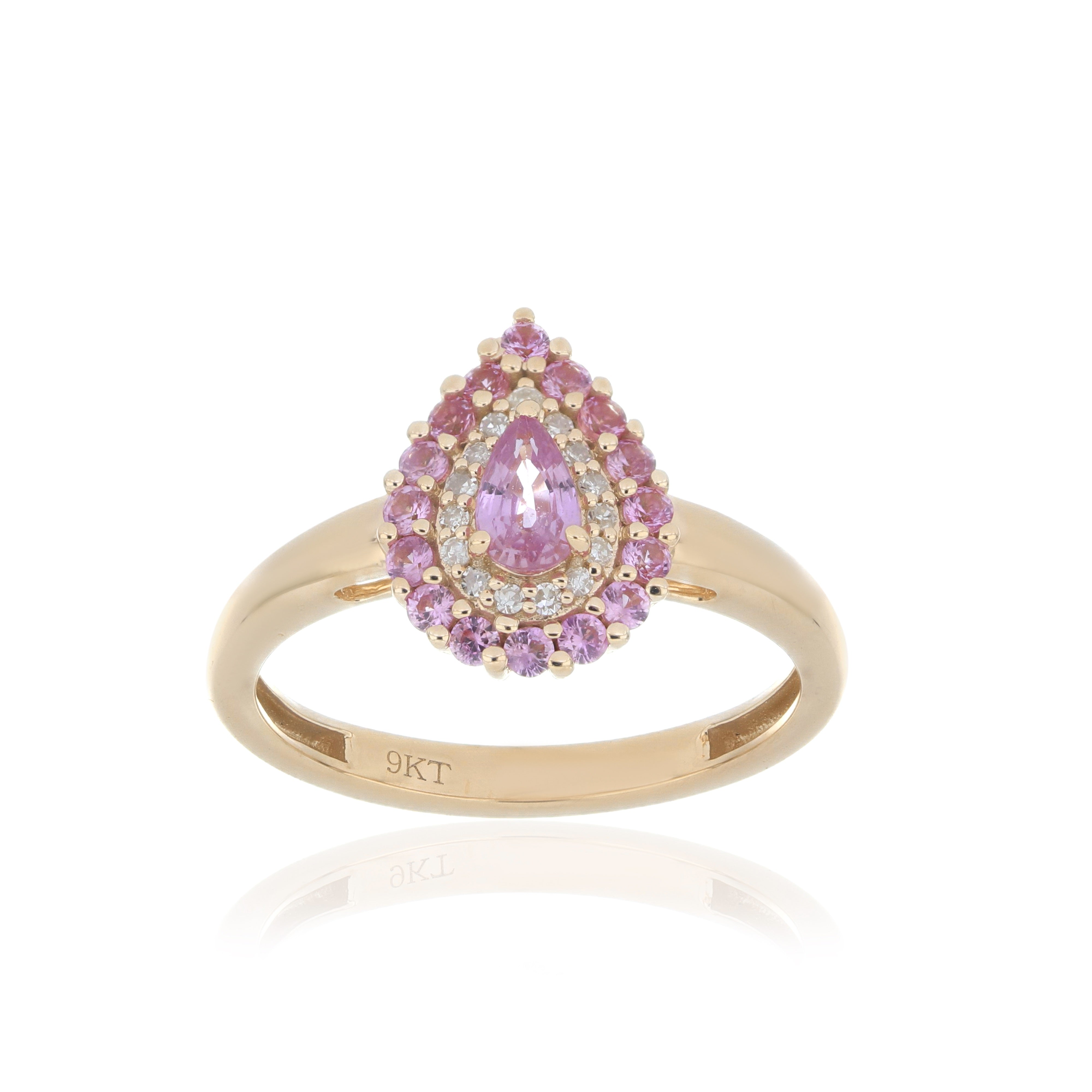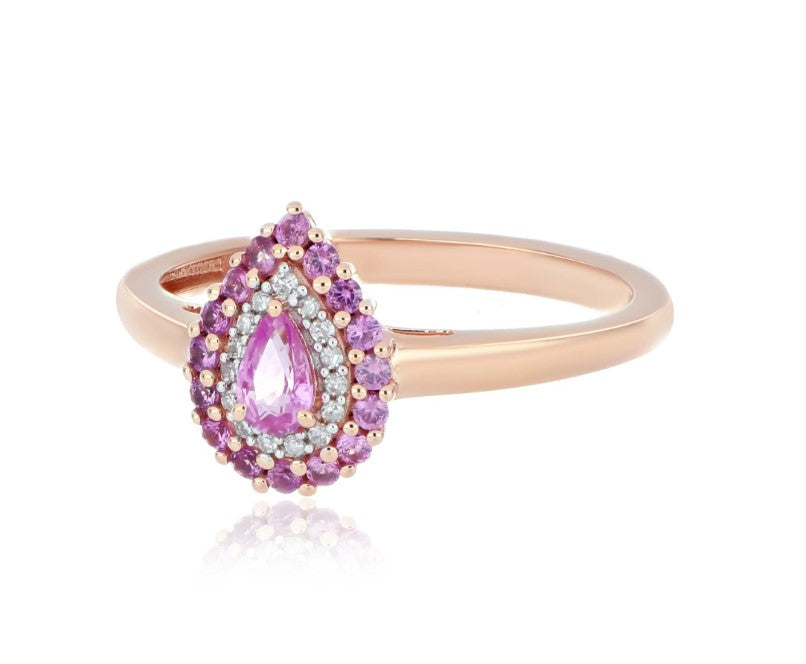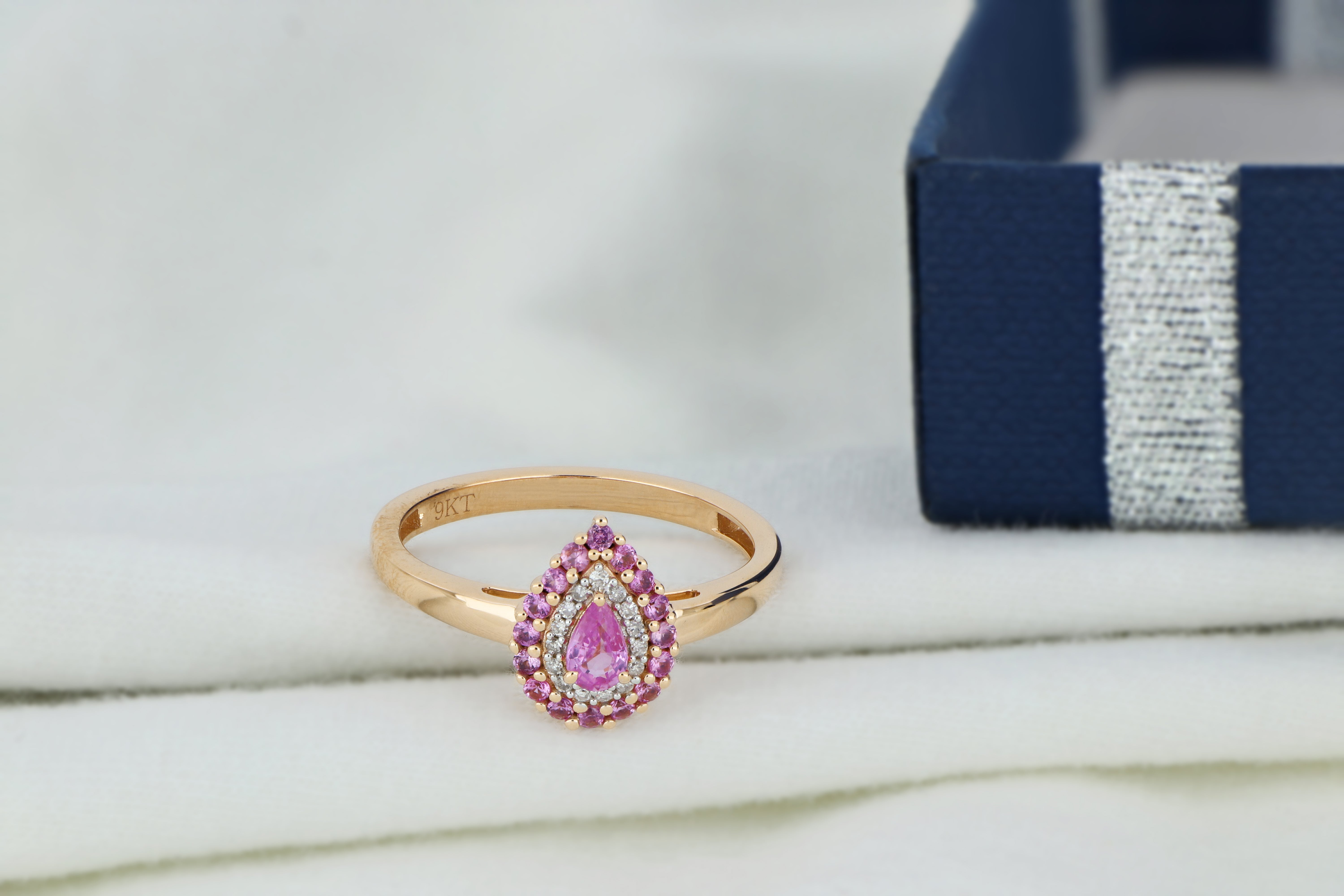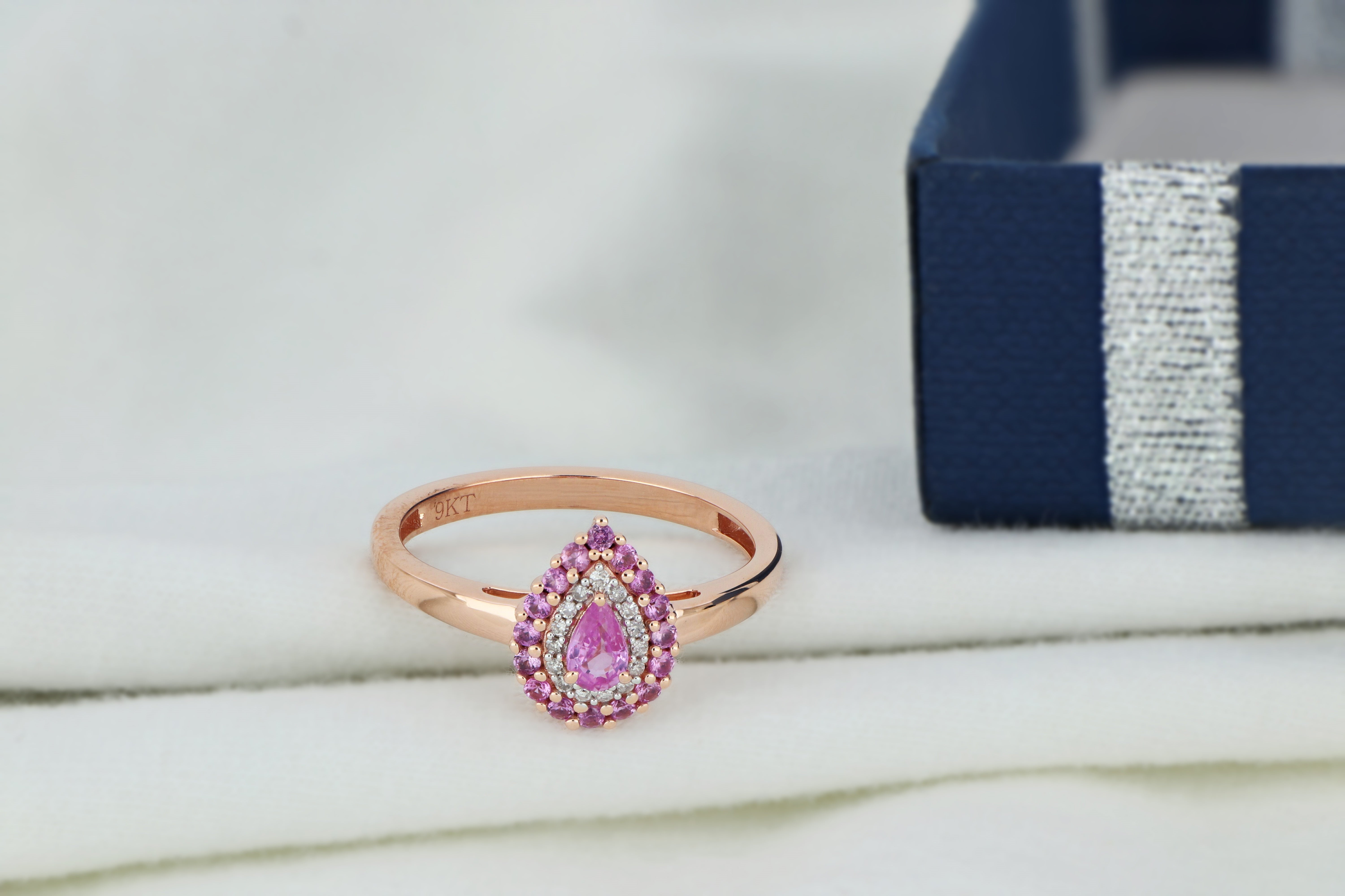 Elevate your style with this exquisite Pink Sapphire 0.60ctw Ring featuring a stunning pink sapphire center and dazzling diamond accents, all set in luxurious 9kt rose gold. The perfect blend of elegance and sophistication, this ring is a timeless addition to any jewelry collection. Embrace the beauty of pink sapphire and the allure of rose gold with this meticulously crafted piece.
