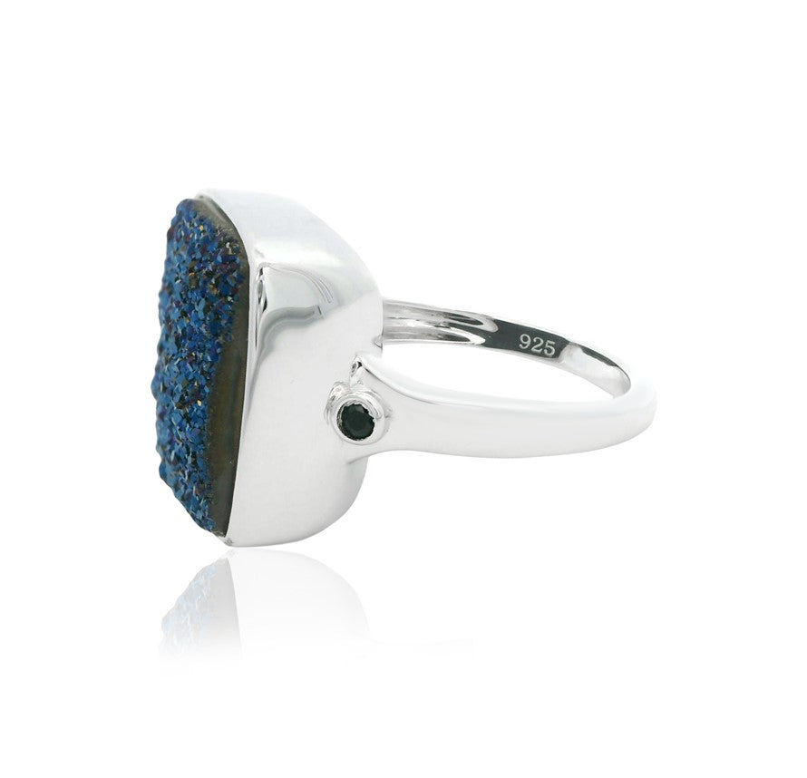 Blue Druzy Quartz With Black Spinel 16.50ctw Ring In 925 Sterling Silver