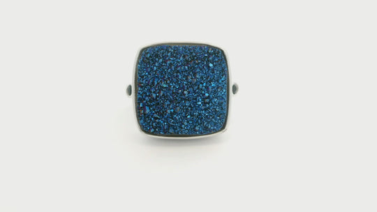 This Blue Druzy Quartz with Black Spinel 16.50ctw Ring showcases an intricate design featuring dazzling gemstones set in premium 925 sterling silver. The vibrant blue druzy quartz is complemented by the striking contrast of black spinel accents, creating a bold yet elegant look. Crafted with attention to detail, this ring combines timeless style with durable craftsmanship, making it a standout addition to any jewelry collection.