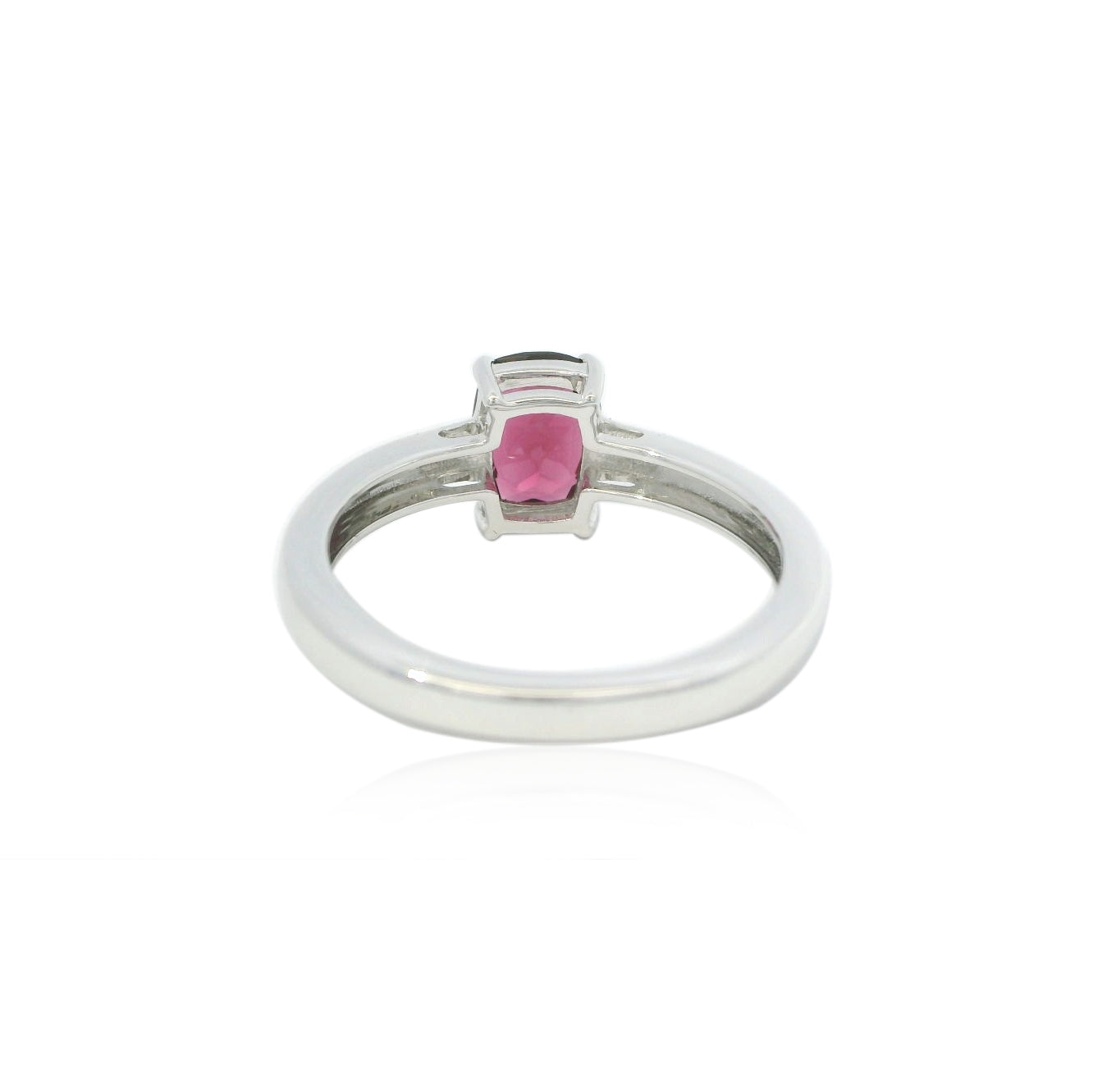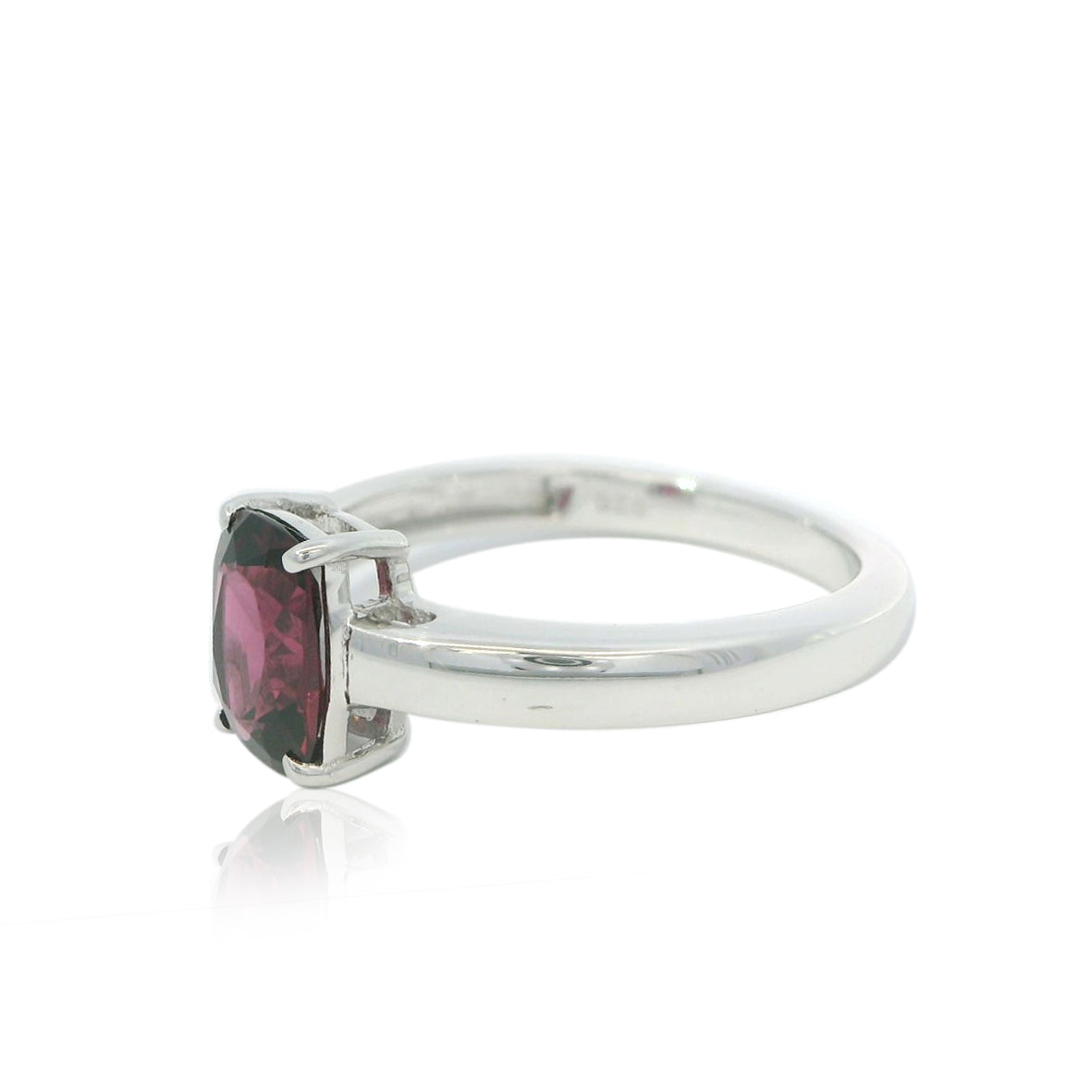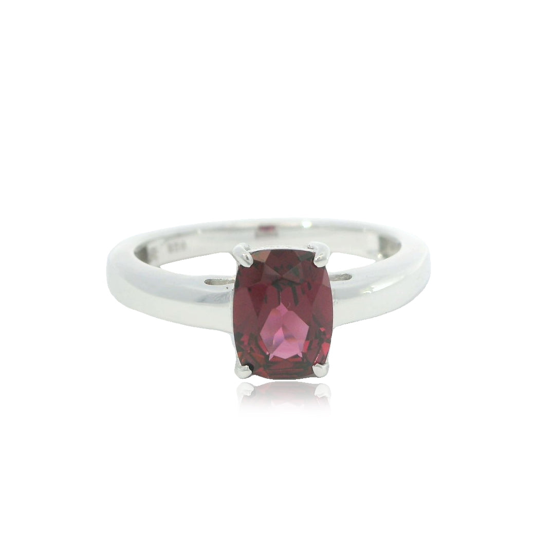 This ring features a 1.60-carat total weight of rhodolite garnet in a striking cushion cut, set in high-quality sterling silver. The deep, vibrant hue of the gemstone is complemented by the timeless elegance of the silver band, creating a refined and sophisticated design. Perfect for adding a touch of brilliance to any occasion, this ring combines durability with classic style.