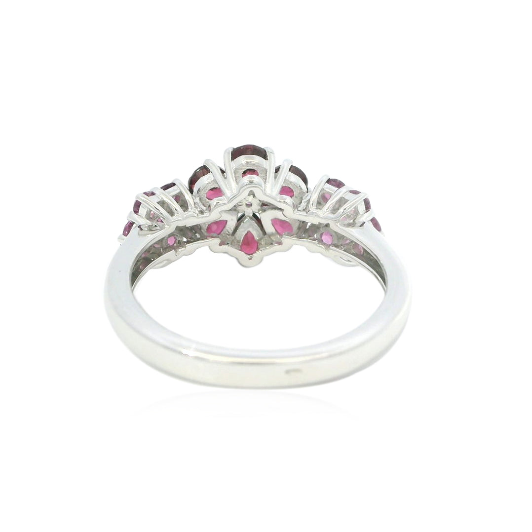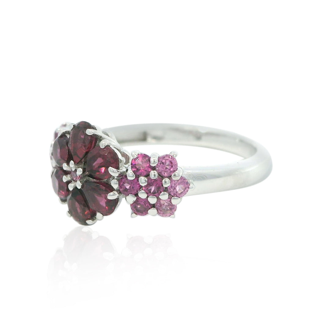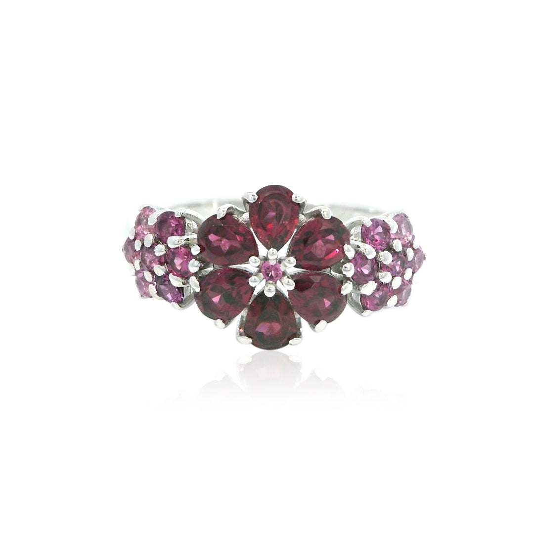 This Rhodolite Garnet Flower Design Ring features a total gemstone weight of 2.10 carats, showcasing vivid rhodolite garnets arranged in an intricate floral pattern. Crafted from high-quality sterling silver, the ring offers a timeless and elegant finish. The vibrant gemstones and detailed design make it a versatile piece, suitable for both everyday wear and special occasions. A beautiful blend of artistry and craftsmanship, this ring is a standout addition to any jewelry collection.