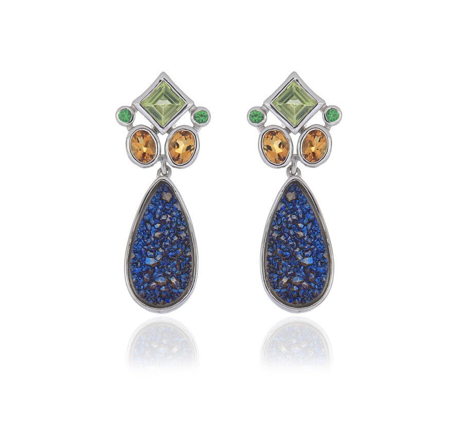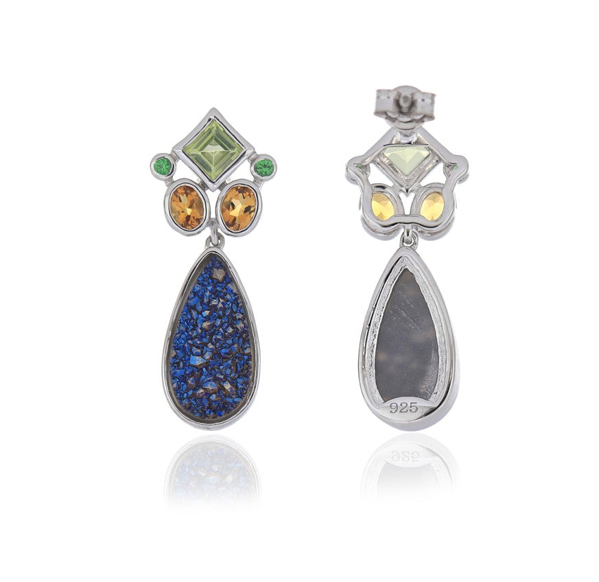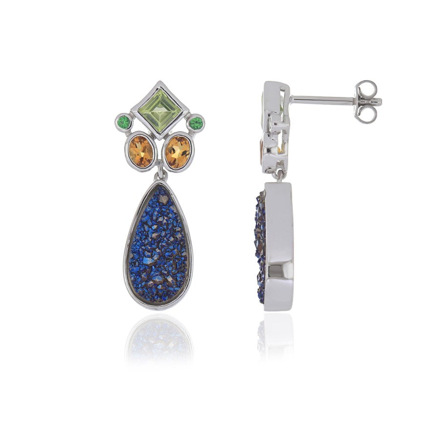 Blue Druzy Quartz With Multi Stone 6.00ctw Push Post Earrings In 925 Sterling Silver