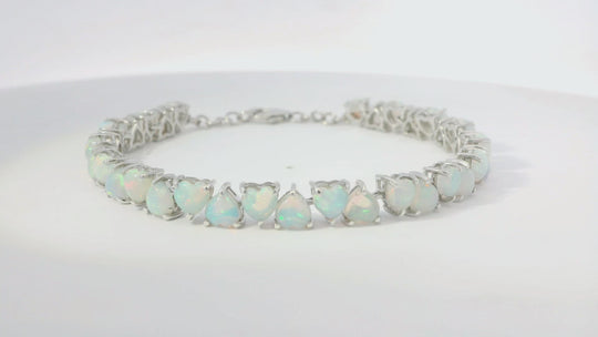 This Ethiopian Rainbow Opal Heart Bracelet features 10.30ctw of genuine Ethiopian Rainbow opal gemstones, each uniquely cut into heart shapes to create a delicate and sophisticated design. The opals exhibit a stunning play of color, making this bracelet a standout piece in any jewelry collection. Crafted in high-quality sterling silver, it offers durability and a polished finish for long-lasting elegance. A timeless accessory suitable for both everyday wear and special occasions.