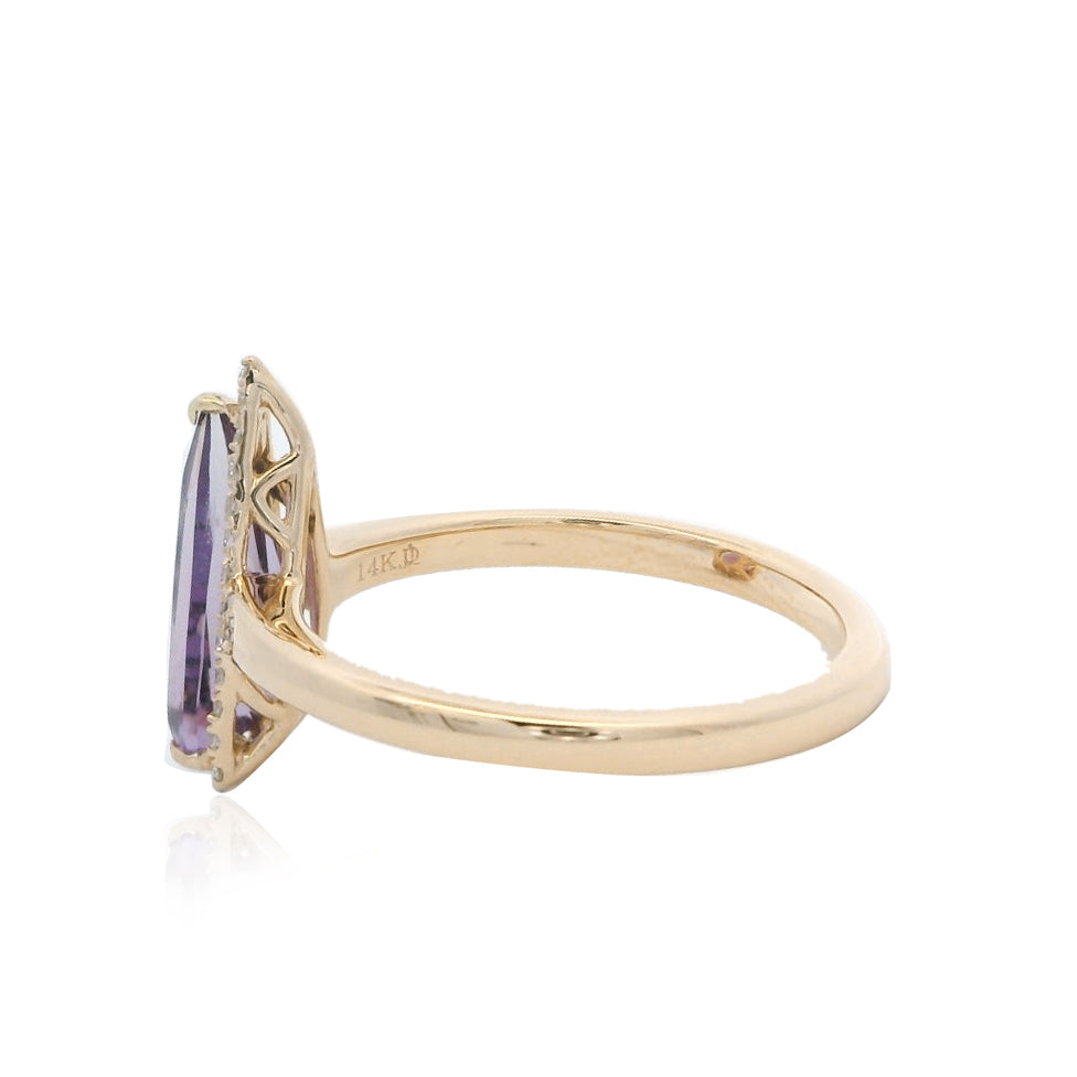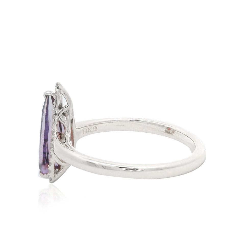 Delicate and graceful, this ring features a 1.00 carat Amethyst, admired for its rich purple hue and natural charm. The centerpiece is enhanced with EF-VS quality diamonds, adding a subtle sparkle that perfectly complements the gemstone’s elegance.
