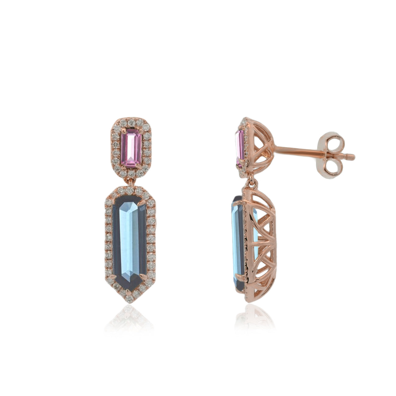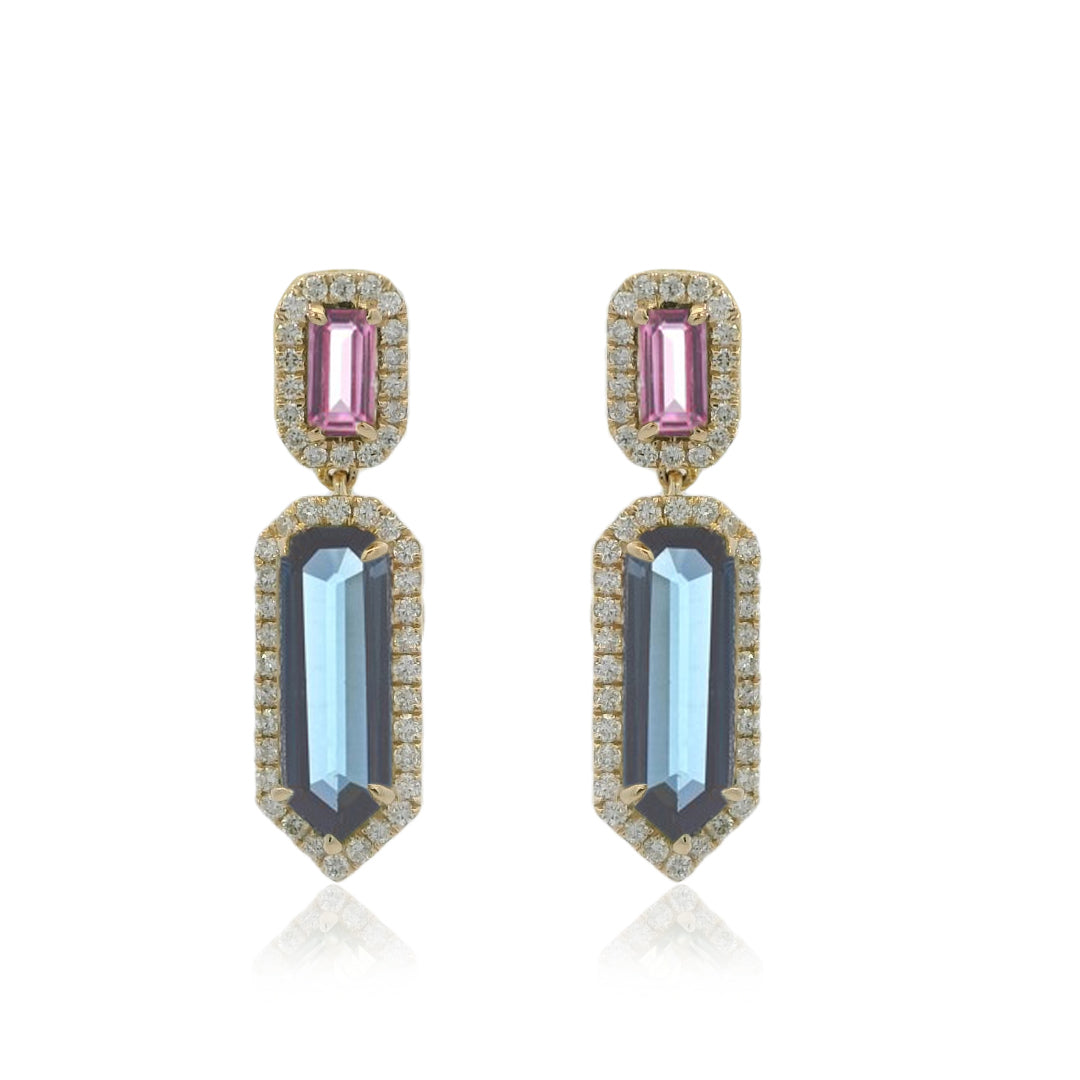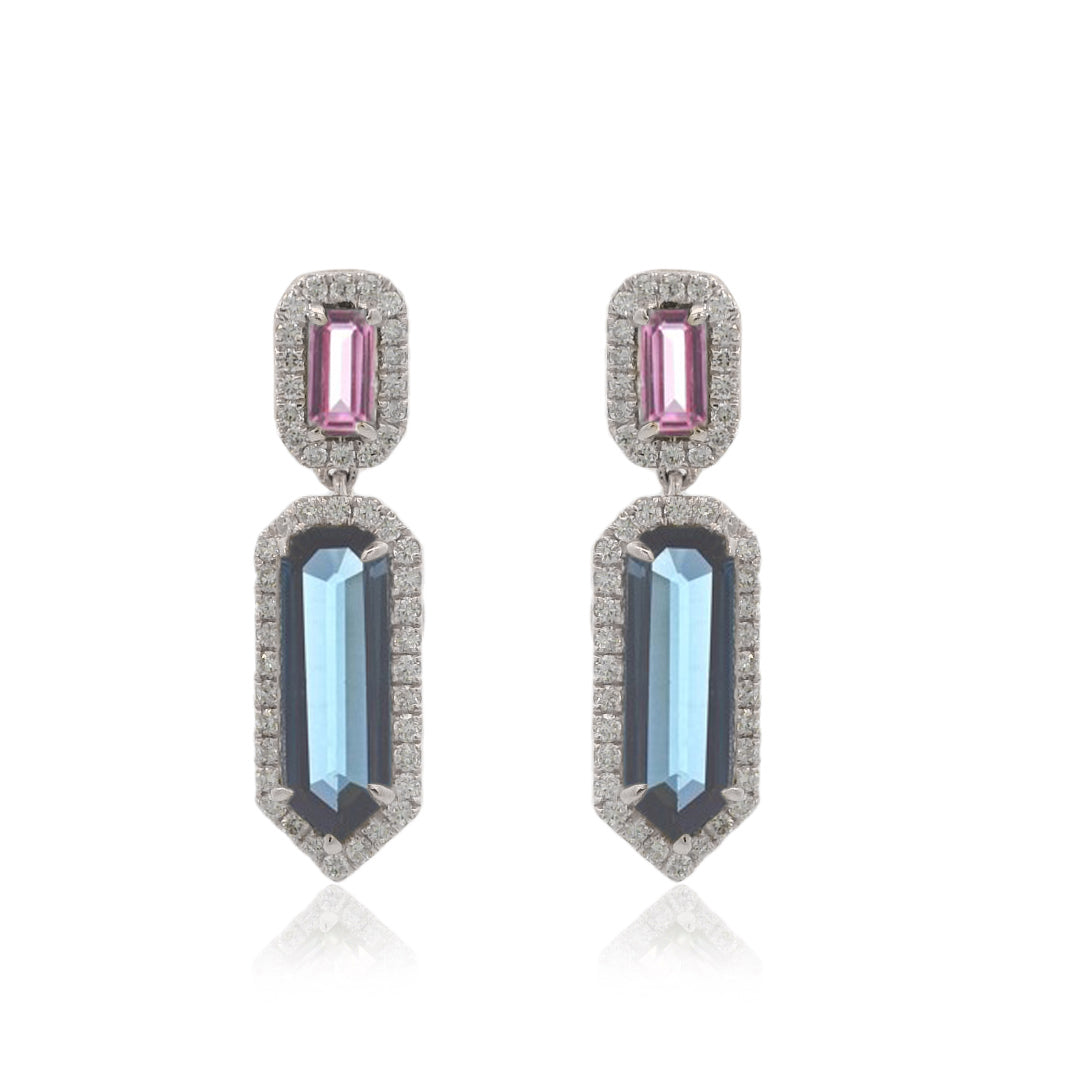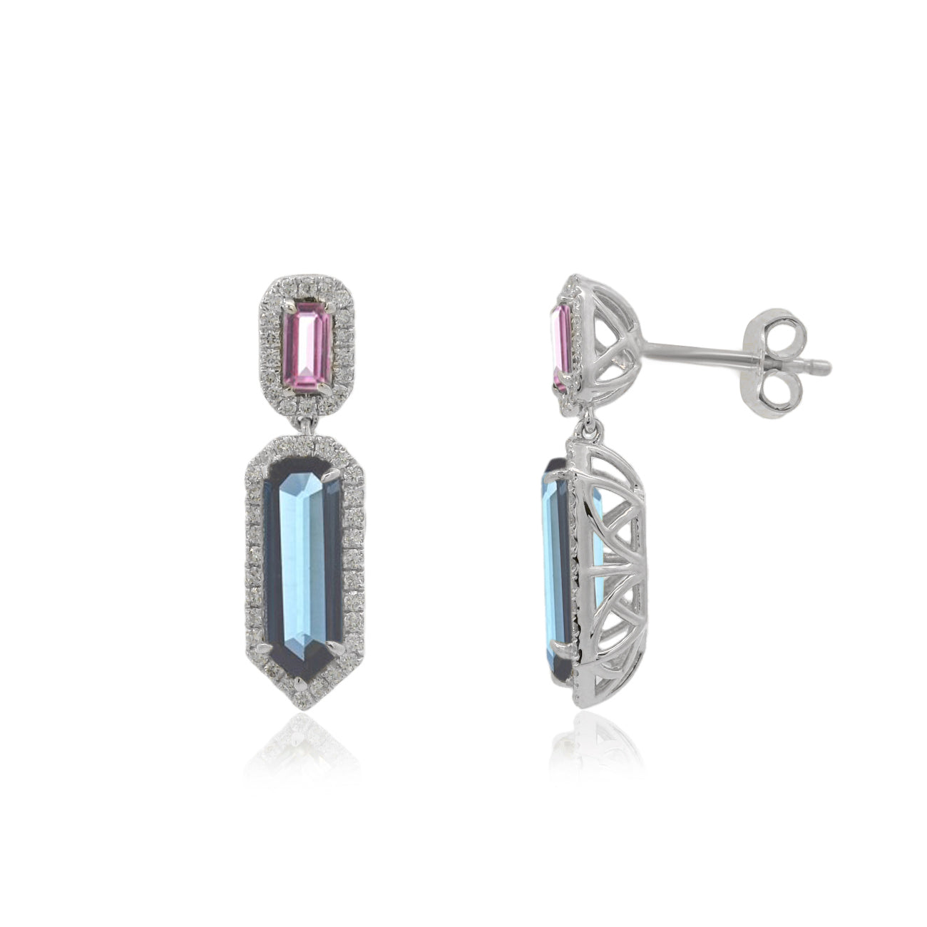 Dramatic and luxurious, these earrings feature a total of 8.20 carats of London Blue Topaz, renowned for its deep, oceanic blue tone and brilliant sparkle. Each gemstone is beautifully accented with EF-VS quality diamonds, enhancing the richness and sophistication of the design.