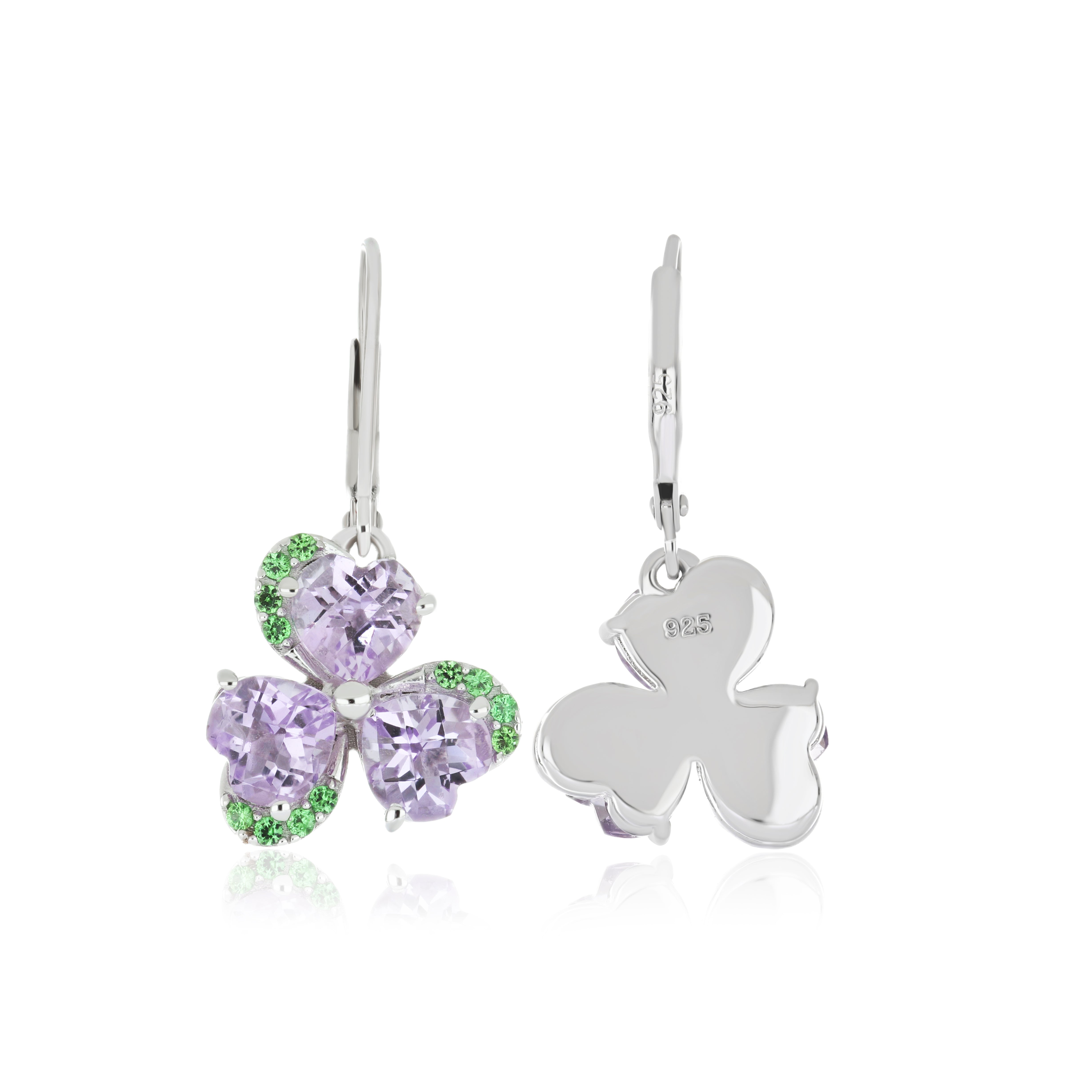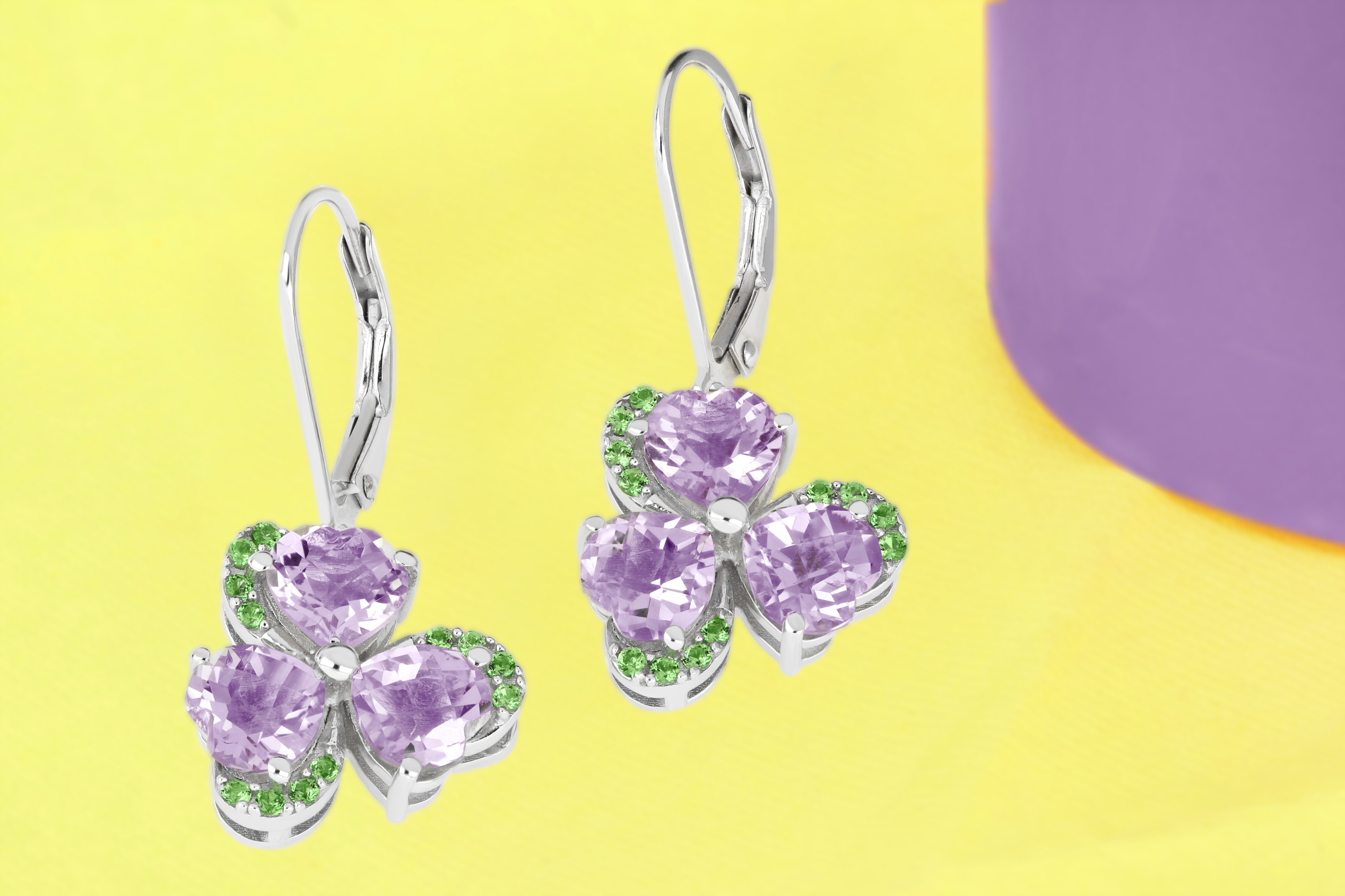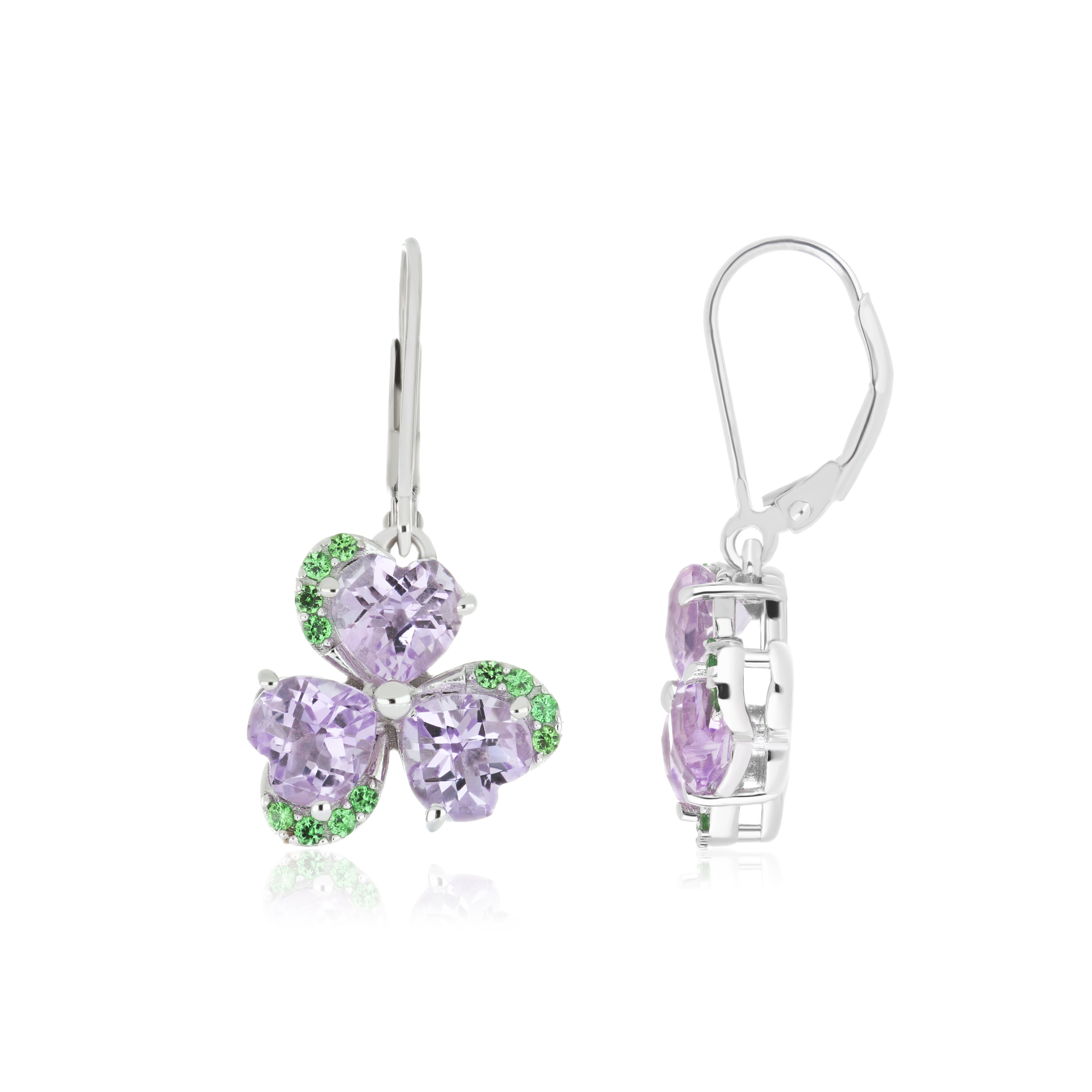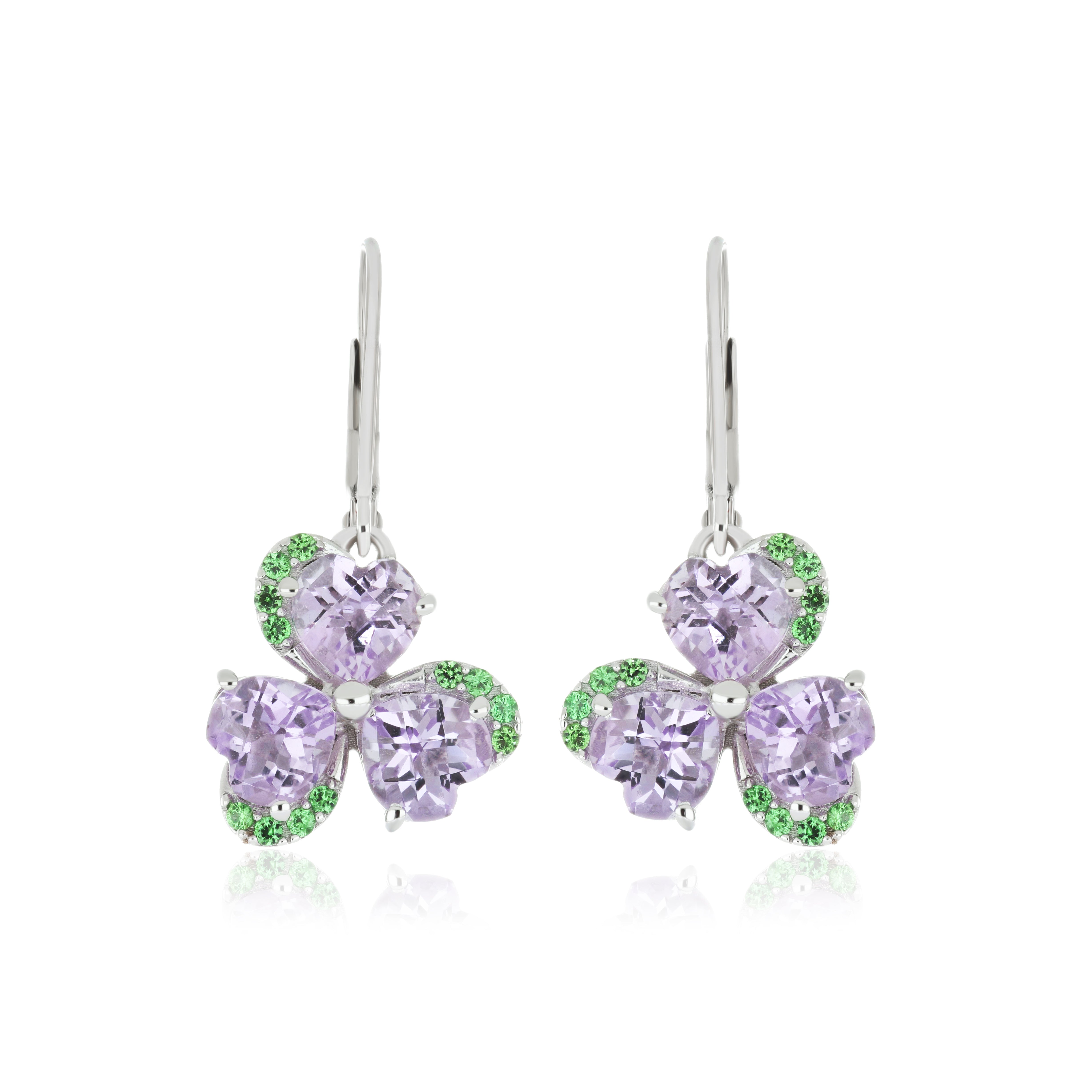 Celebrate elegance with these Rose de France with Tsavorite 4.90ctw Lever Back Earrings in 925 Sterling Silver. The soft, pastel lavender tones of Rose de France perfectly complement the vivid green brilliance of Tsavorite, creating a refreshing and sophisticated contrast. Crafted in lustrous sterling silver, the lever back design ensures both security and comfort, making these earrings a versatile choice for daily wear or special occasions. A graceful fusion of romance and vibrancy, these earrings are a statement of refined style.
