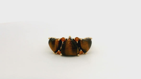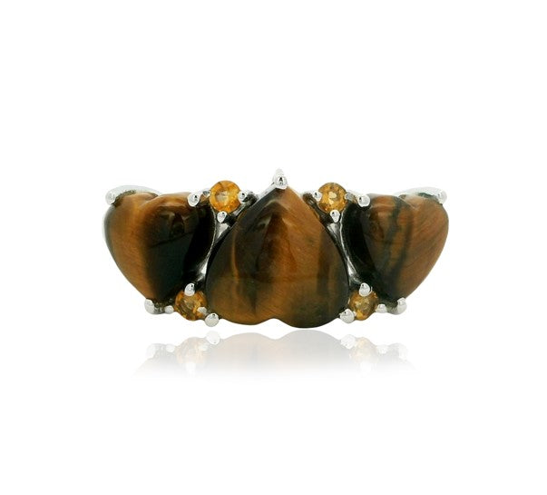 At its heart lies a captivating Tiger Eye, known for its golden-brown luster and grounding energy. Accented by radiant Citrine stones, which shimmer with golden-yellow hues, this ring embodies positivity, strength, and balance. The polished sterling silver band enhances the brilliance of the stones, offering durability and refined style.